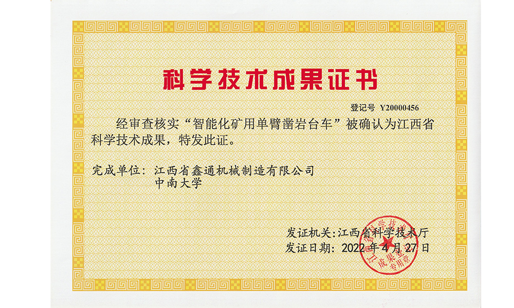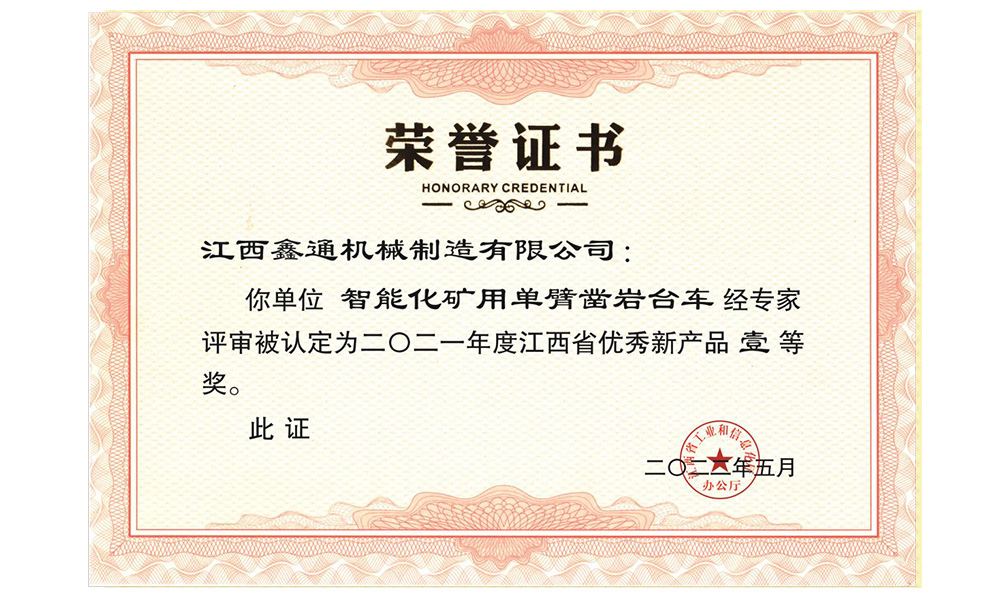 智能化礦用單臂鑿巖臺車榮譽證書